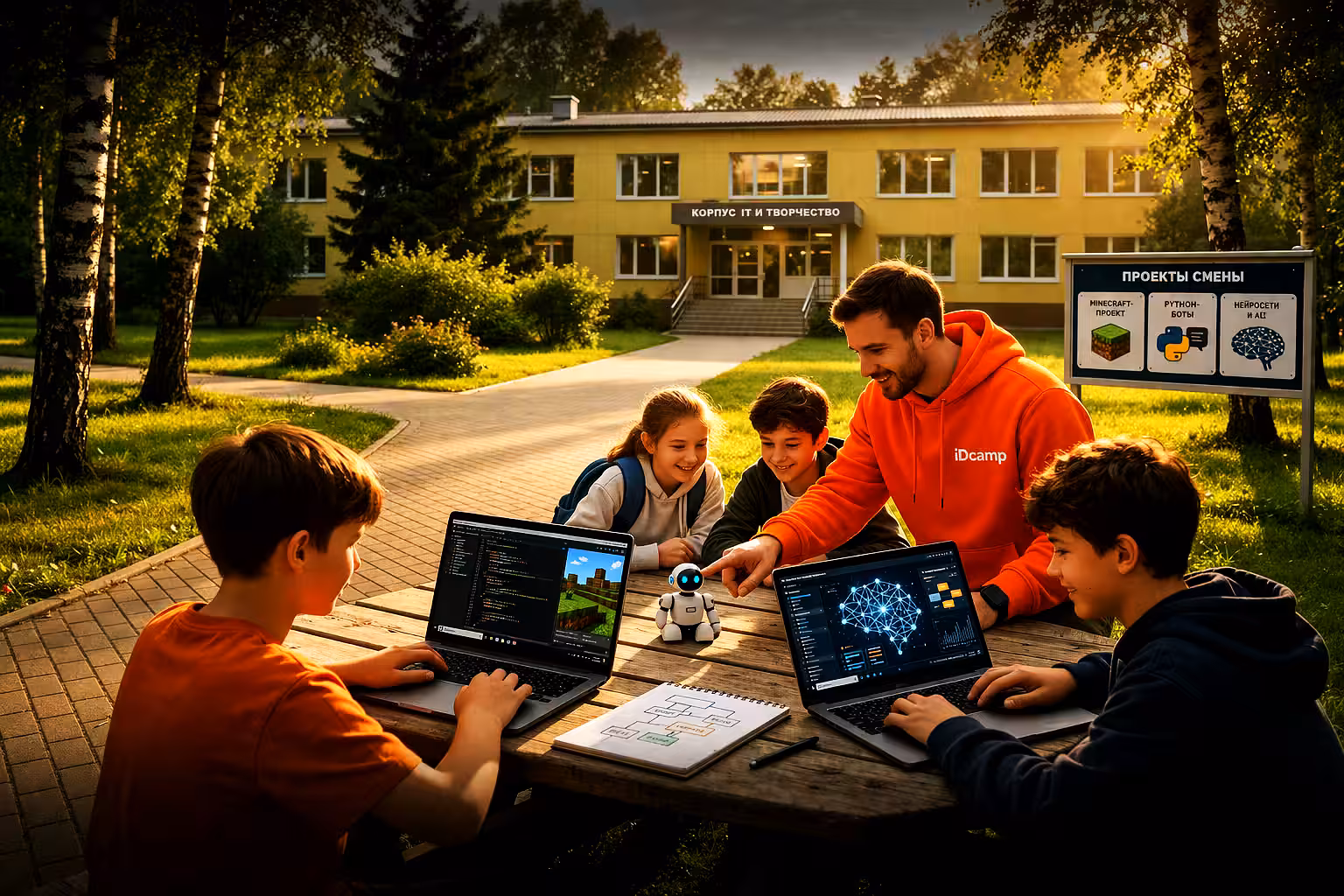 Программа августовских смен не отличается от летних — полный IT-курс по возрасту. Дети 7–10 лет работают со Scratch и Minecraft. Дети 10–12 лет изучают Python и основы AI. Подростки 13–14 лет — Python Advanced, боты, работа с API и нейросетями. Финал — хакатон: каждый защищает свой проект.